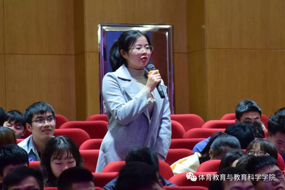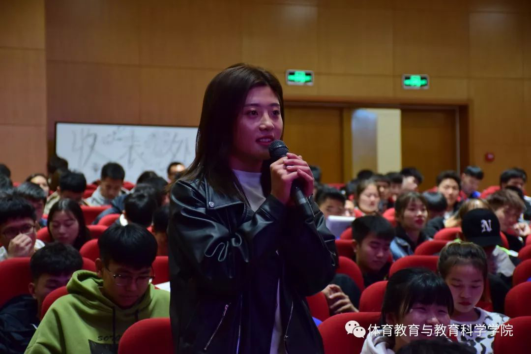 第三部分交流。2017级体育教育专业学生周凯说“听完您的讲座,我受益良多。作为一名新时代的青年大学生,应该要有一种艰苦奋斗,为国争光的社会责任感,使命感和奉献精神,要有崇高的职业理想,健全的心理素质,保持爱国主义、集体主义、团结协作等优良作风。”2018级体育教育专业张露露同学说:“在上课过程中,给我感触最深的就是体操老师的严谨教学、身体力行。老师教我们下达口令时要准确严肃,声音洪亮,容不得一丝马虎,不能有一个字出错。教导我们要端正学习态度,要懂原则、守规矩,具备教师应该有的气度与风范。”两位同学都发自你内心的说出自己上体操课和听讲座的心声。