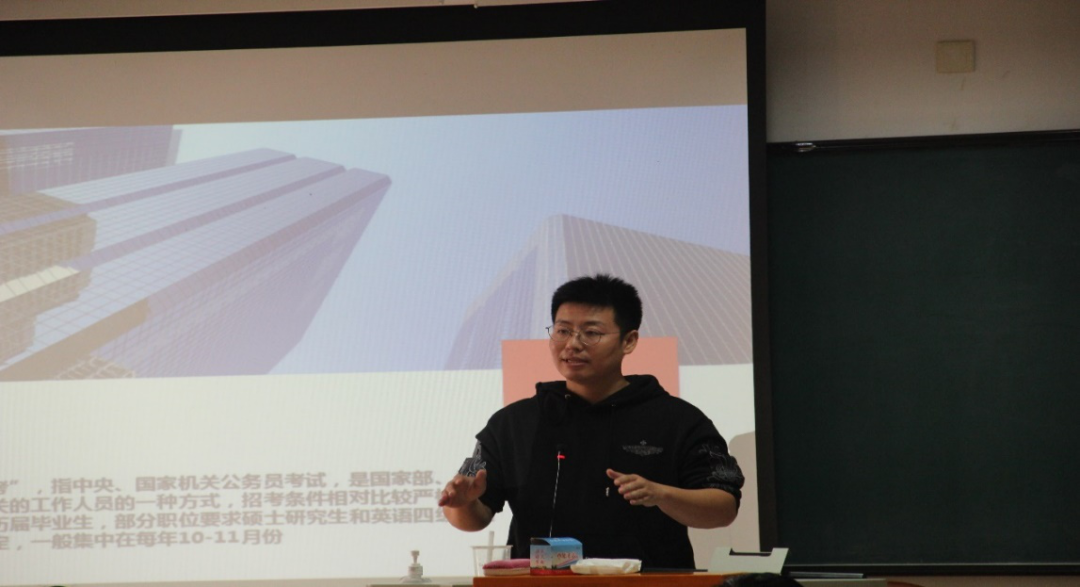 在教学楼A202举办国家公务员考试讲座,研究生辅导员孙志文为同学讲解国考内容。