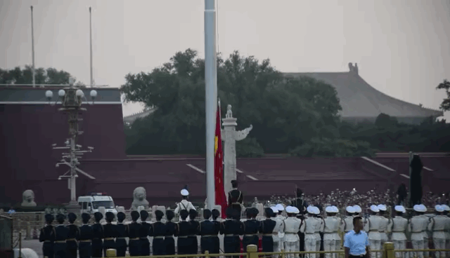 7月13日凌晨3点半,月朗星稀,大家骑着共享单车,一路欣赏着北京夜景,来到天安门广场,观看了升国旗仪式。天安门国旗护卫队员们迈着整齐的步伐,喊着嘹亮的口号,跨过金水桥,走向升旗台。4点56分,升旗仪式开始,伴随着雄壮的国歌声,五星红旗冉冉升起,全场高唱国歌。此时,一个多小时的劳累和疲乏全部化为激动振奋、骄傲和自豪。