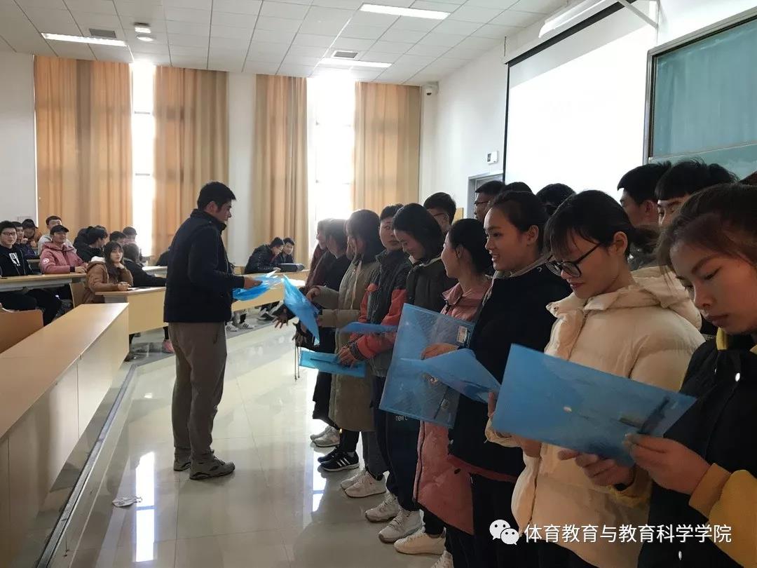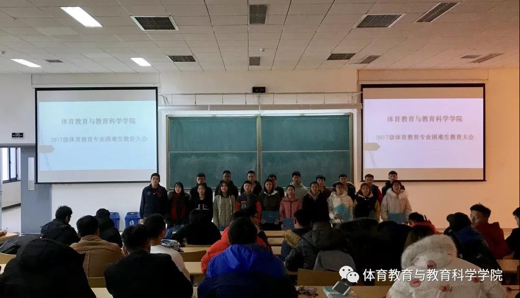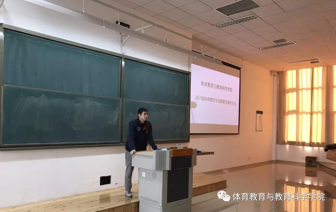 在教学楼A201举行困难生教育大会。微密圈2017级辅导员解元主持会议,2017级体育教育专业本学年困难生参加。