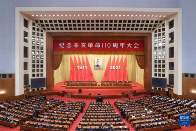人民大会堂大礼堂气氛庄重热烈。主席台上方悬挂着“纪念辛亥革命110周年大会”会标,后幕正中是孙中山先生画像,10面红旗分列两侧,上面悬挂的“1911”“2021”字标格外醒目。