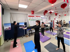 志愿者傅亿汝为居民介绍了老年人进行瑜伽锻炼的益处,包括增强身体柔韧性、增强身体力量、改善姿势和平衡、缓解压力和焦虑等,尤其强调了老年人在练习瑜伽时应该根据自己的身体状况和健康问题选择适合的方法,避免过度运动或造成身体损伤,居民交口称赞。