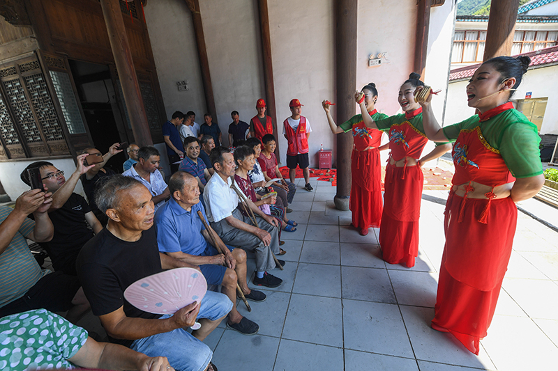 2021年9月1日,浙江省杭州市临安区高虹镇廉政文艺宣传队在石门村表演快板小段《清廉高虹》。新华社记者 徐昱 摄
