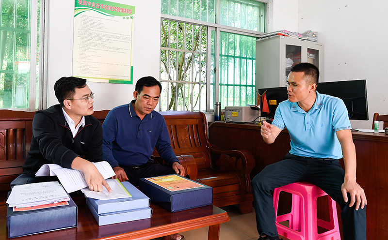 2021年11月13日,在海南省琼中黎族苗族自治县湾岭镇加章村委会,纪检监察干部(左一)在查阅乡村振兴及村级财务支出相关材料。新华社记者 杨冠宇 摄