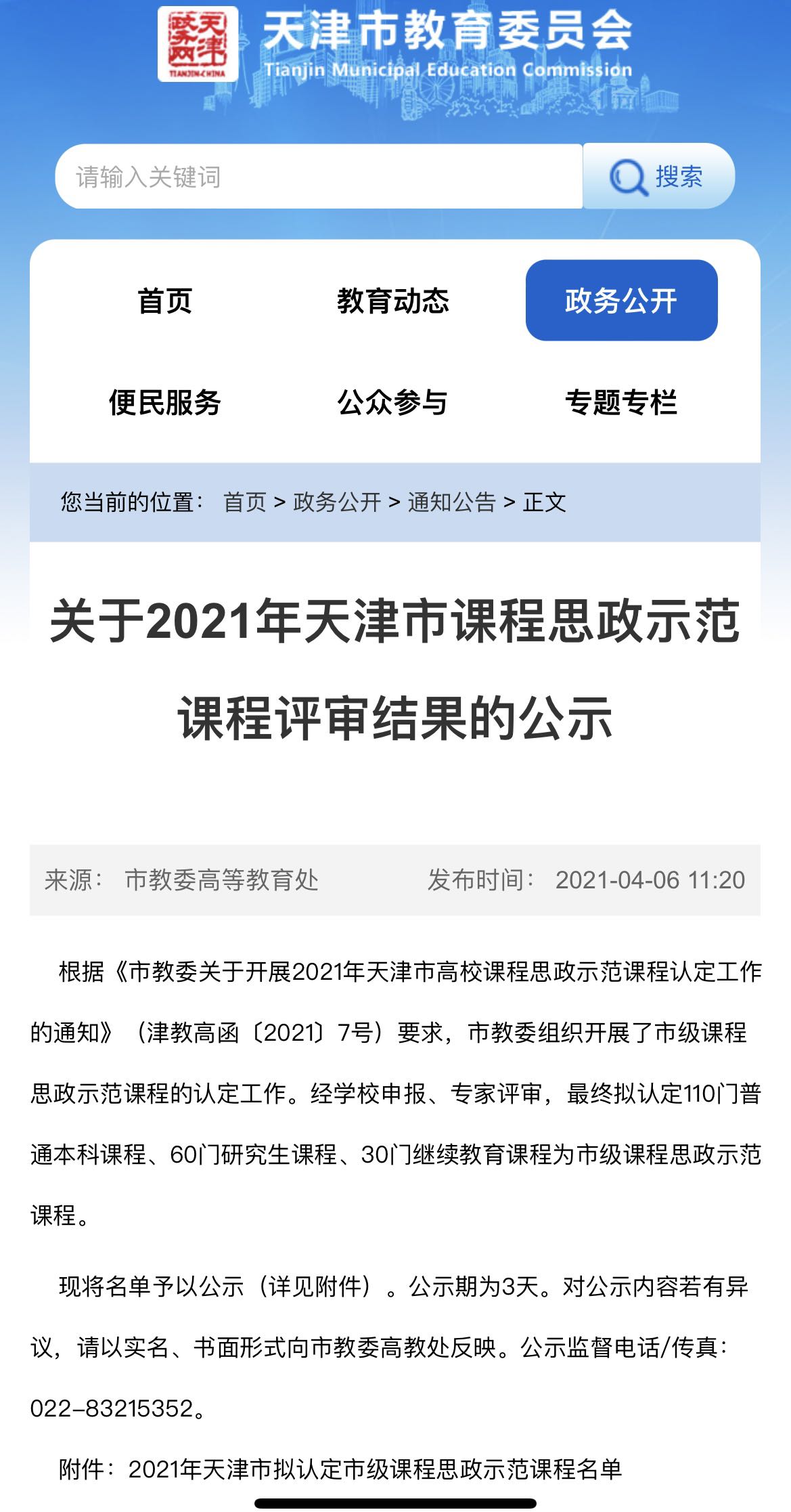 【公示】关于2021年天津市课程思政示范课程评审结果的公示